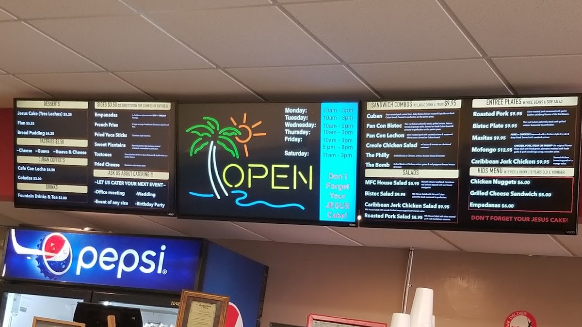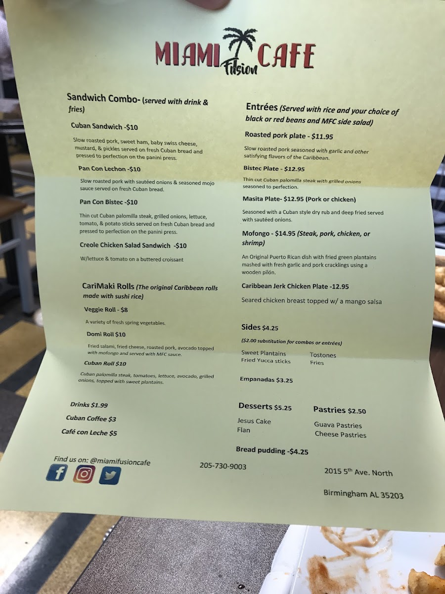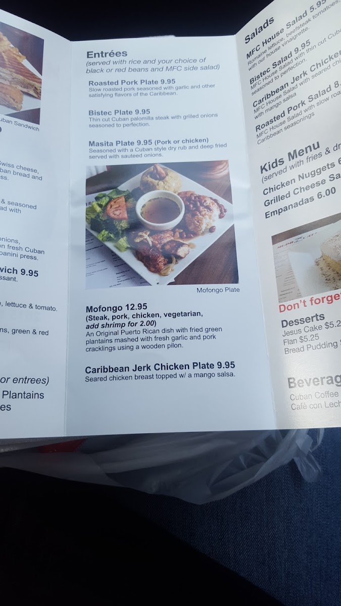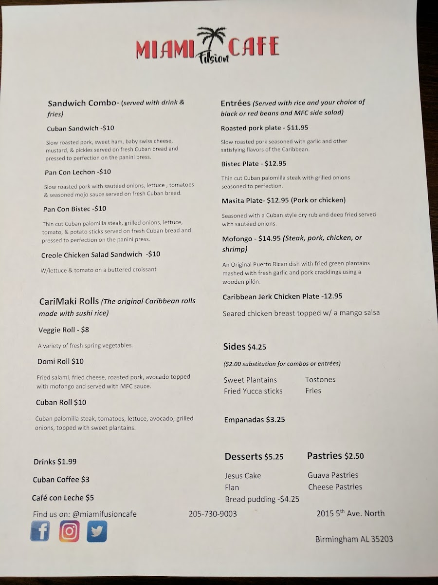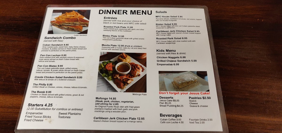 The menu at Miami Fusion Cafe offers a variety of Caribbean-inspired dishes with a focus on Cuban cuisine. It is organized into several groups to cater to different tastes and preferences.