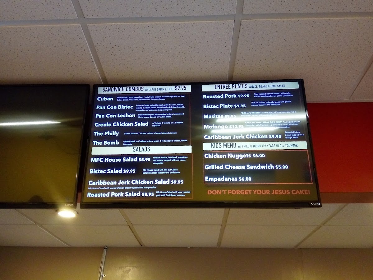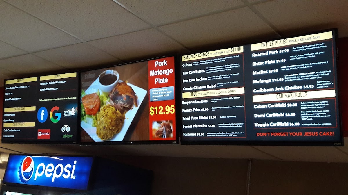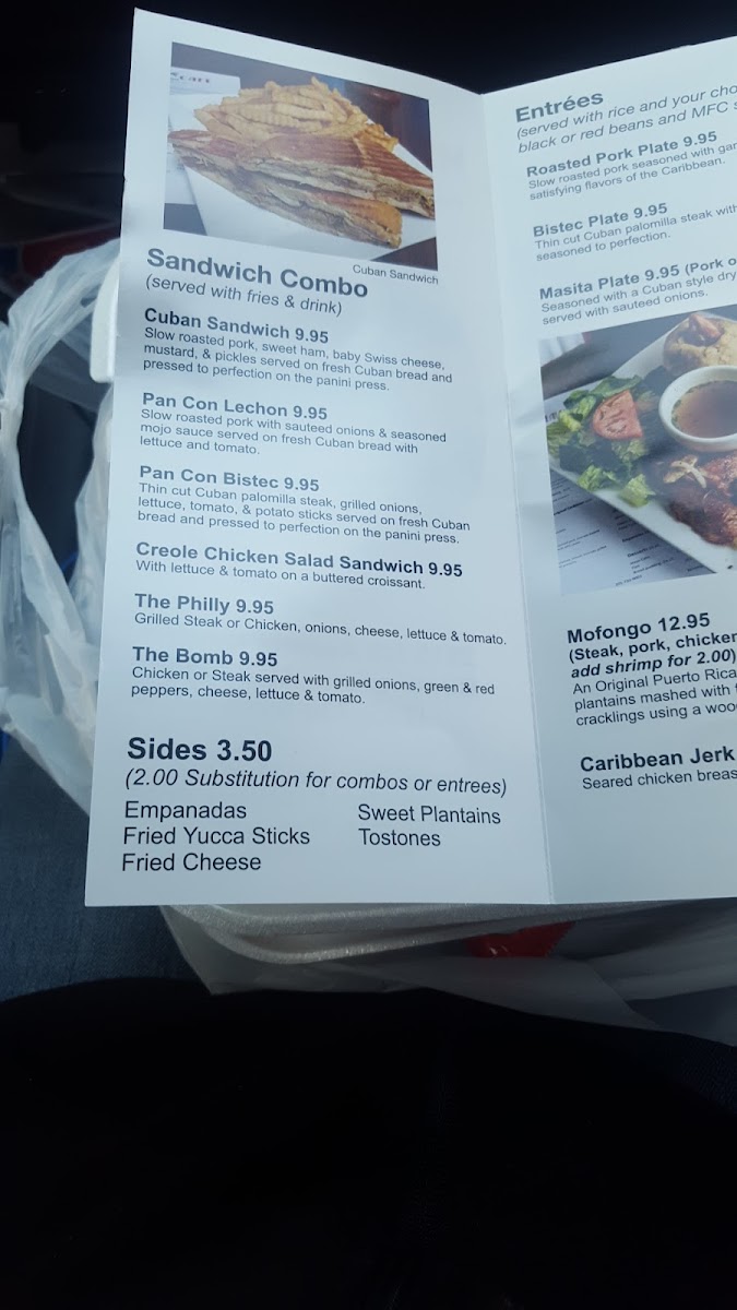 - Sandwich Combos: These include pressed Cuban-style sandwiches such as the Cuban Sandwich with slow-roasted pork, ham, Swiss cheese, mustard, and pickles on Cuban bread, and the Pan Con Bistec featuring thin-cut Cuban palomilla steak with grilled onions and potato sticks. Each combo is typically served with a fountain drink and french fries.